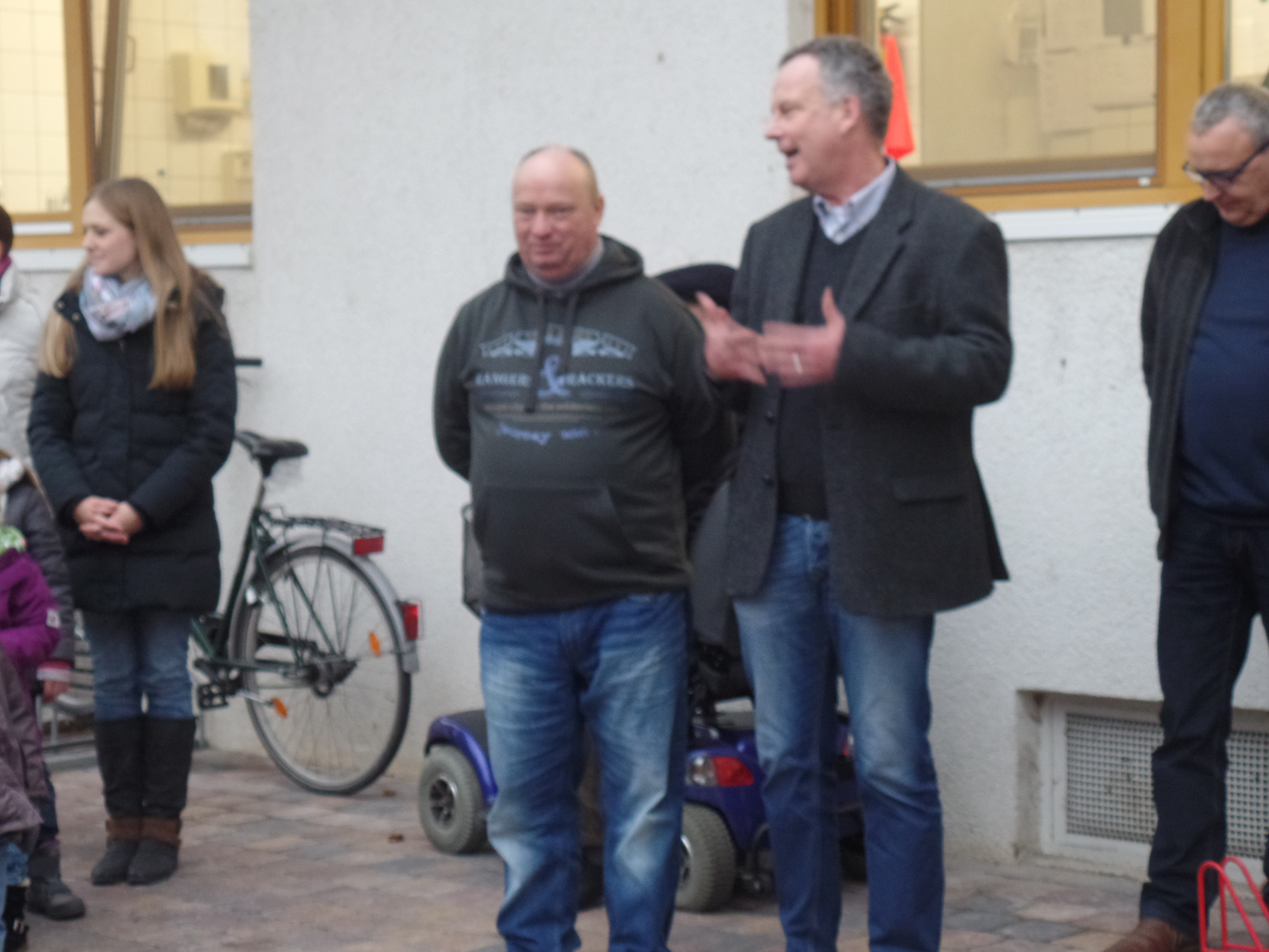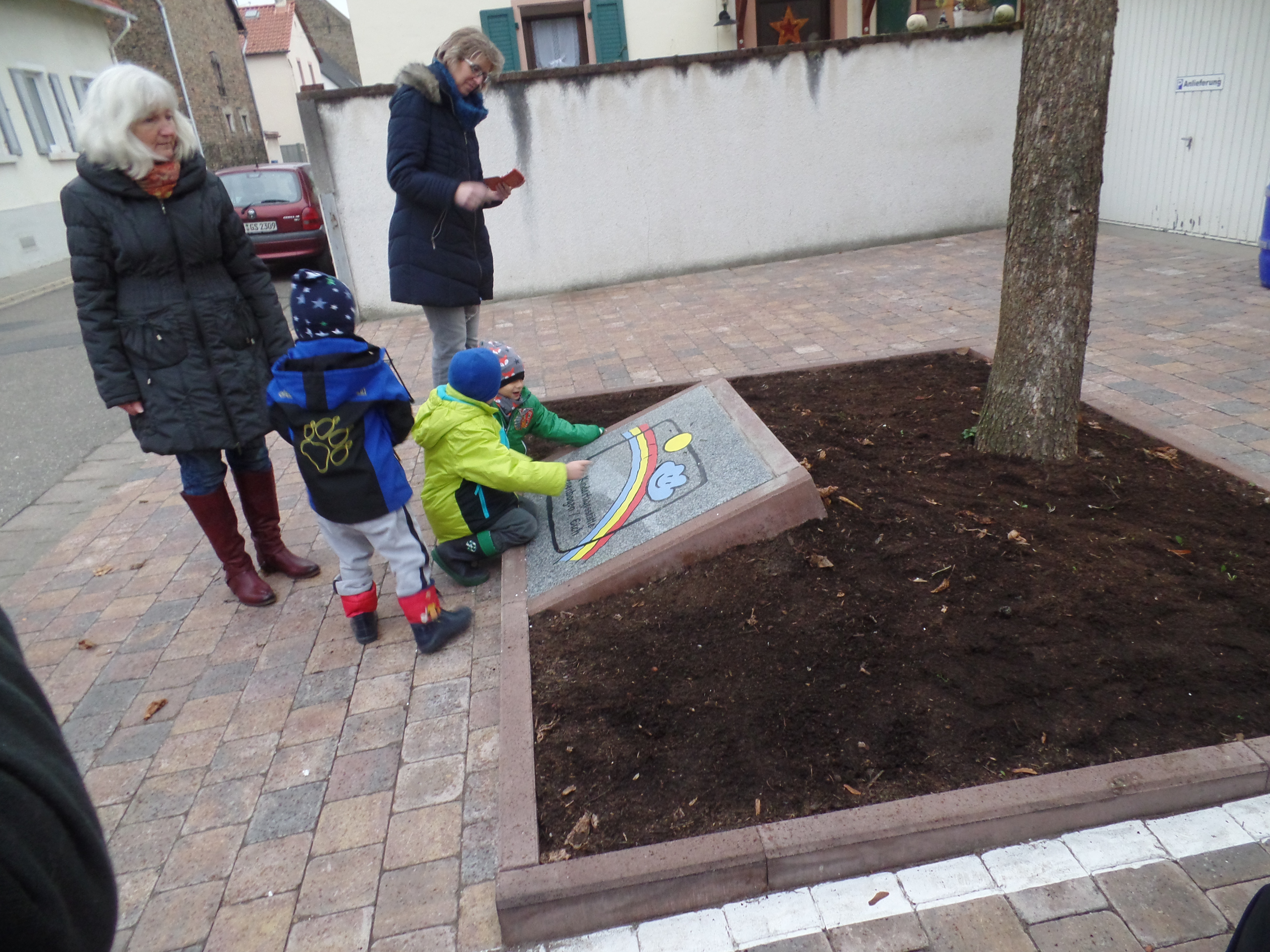 Am Freitag, den 02.12. wurde in der evangelischen Kindertagesstätte Regenbogen der neue Vorplatz offiziell eingeweiht. Früher war dort eine große Hecke und ein kleiner Hof dahinter. Hier ist nun ein Behindertenparkplatz, ein Kurzzeitparkplatz und ein Zuliefererparkplatz entstanden. Der sehr schön gestaltete Platz verleiht dem Eingang der Kita ein neues Flair. Mit zum Flair bei trägt auch das neue kunstvoll umgesetzte Logo der Kita in Stein.